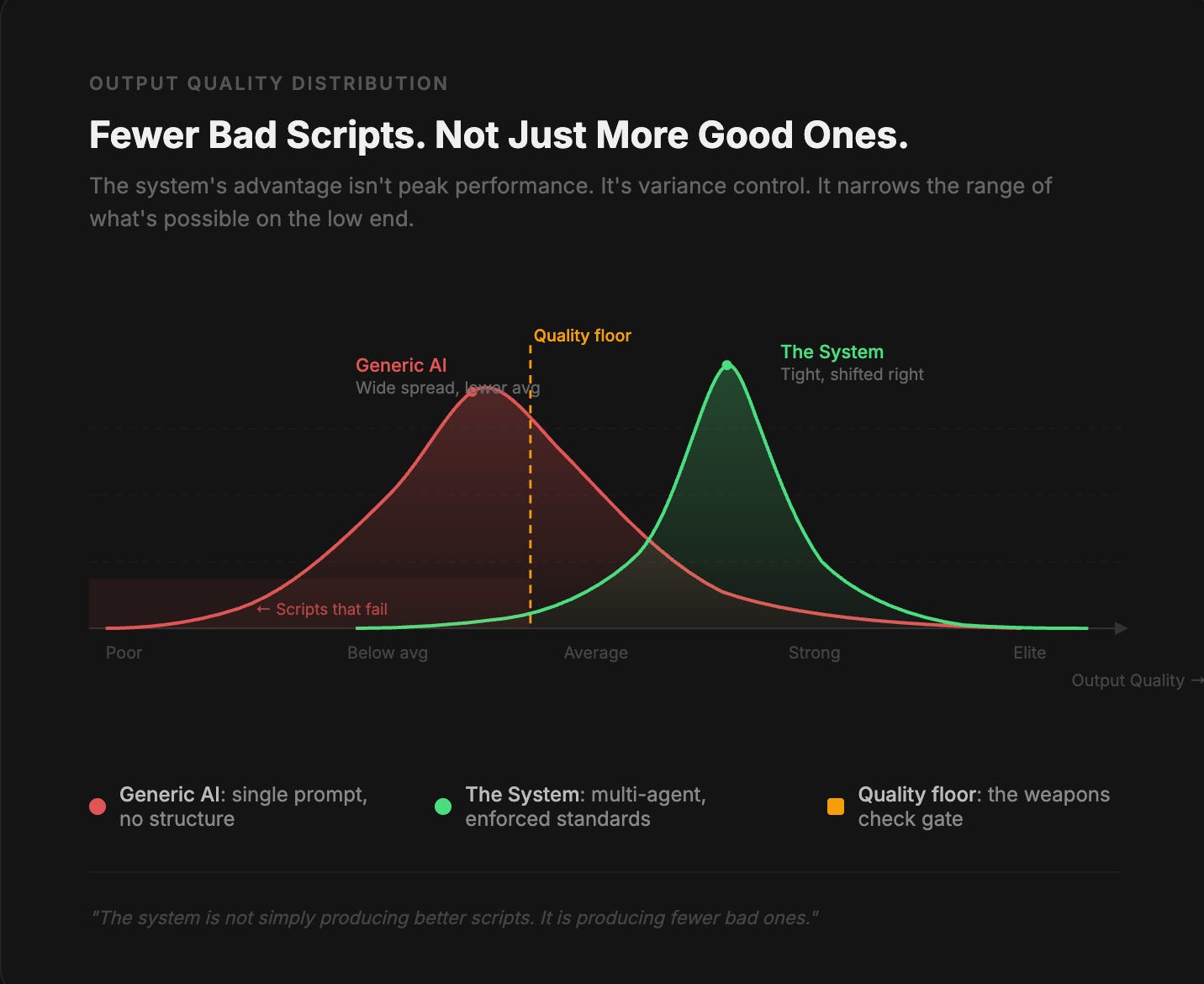 The system is not simply producing better scripts, it is producing fewer bad ones. And in a domain where distribution is sensitive to small differences in structure, that consistency compounds.