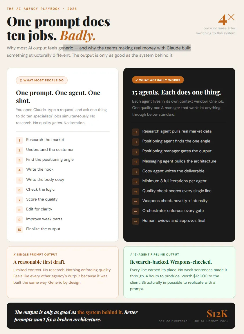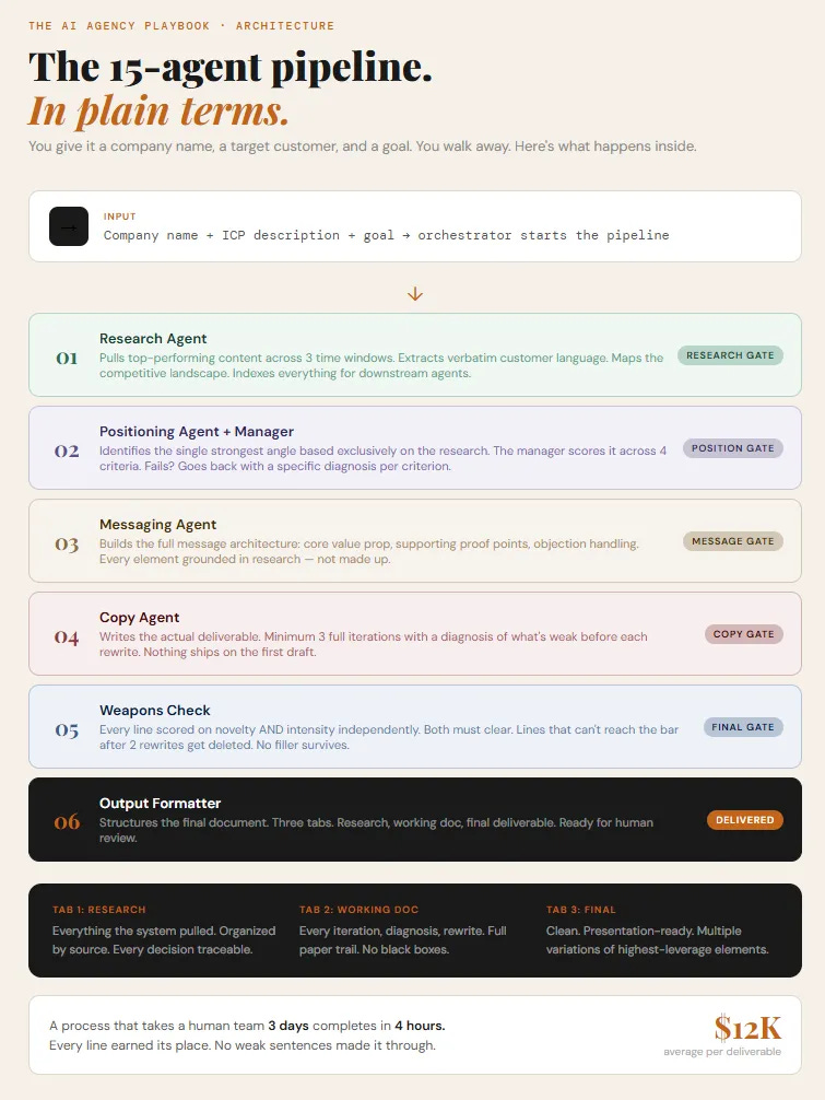 His team now runs 15 specialized Claude Code agents to build go-to-market packages for B2B clients. The kind of work that used to take 2 weeks. The pipeline does it in 4 hours.
